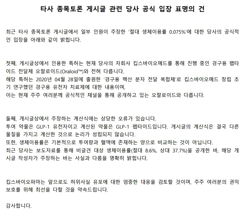 타사 종목토론 게시글 관련 당사 공식 입장 표명의 건